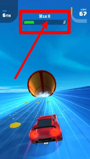 3.关卡信息提示:顶部中央会显示当前关卡数,同时有绿色进度条辅助了解赛道剩余距离及终点位置。