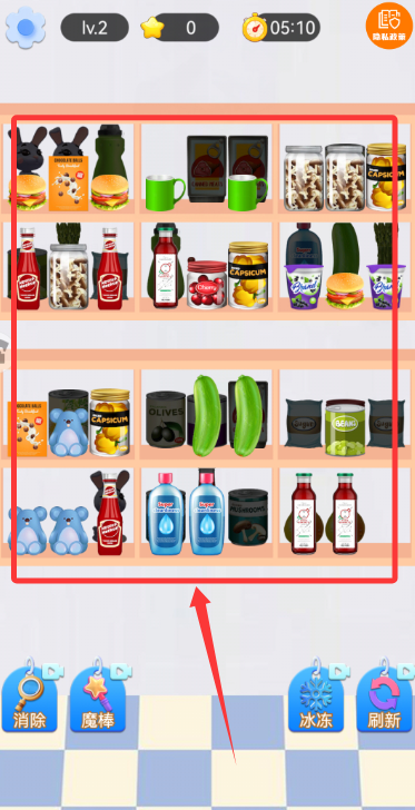 3、动态关卡设计随着游戏推进,货架布局会越来越复杂,会出现特殊形状的货架和隐形商品,增加了挑战性。