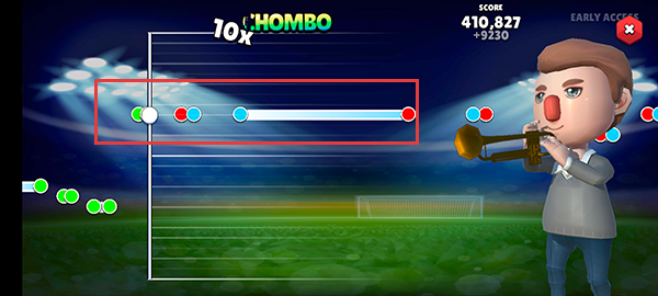 2、双指协同演奏:进入界面后,用一根手指点击控制长号发声,同时另一根手指滑动调节音高,将音高移动到准确音域部位,跟随节奏完成整首曲目的演奏。