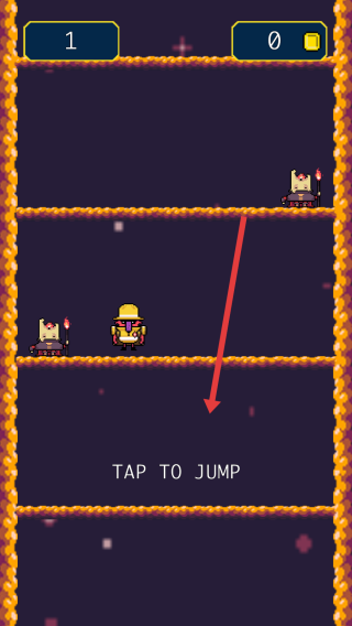 2、游戏中,依据“TAP-TO-JUMP”提示,点击屏幕让角色跳跃,避开敌人,在多层平台前进,争取高分。