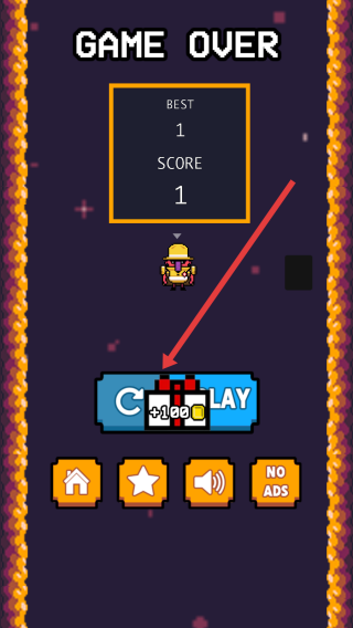 3、游戏失败(GAME-OVER)后,可点【PLAY】重开,或看广告领奖励(+100金币),刷新最佳分数(BEST-SCORE)。