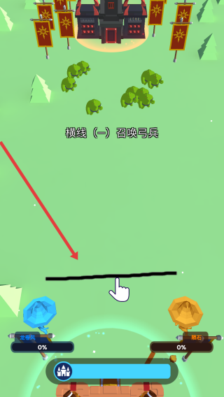 1、关卡开局,在屏幕画横线(—),触发“召唤弓兵”指令,生成蓝色弓兵部队。