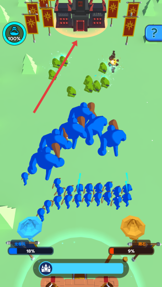 3、部队前行中,消耗资源(蓝色水晶),与敌方绿色部队交战,突破防线,攻打城堡,赢得胜利。