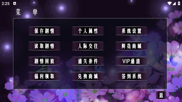 3、用【保存剧情】【读取剧情】管进度,【个人属性】【人际交往】看状态,【系统设置】调参数;借【剧情回放】重温,【鲜花商城】【兑换商城】购物品。