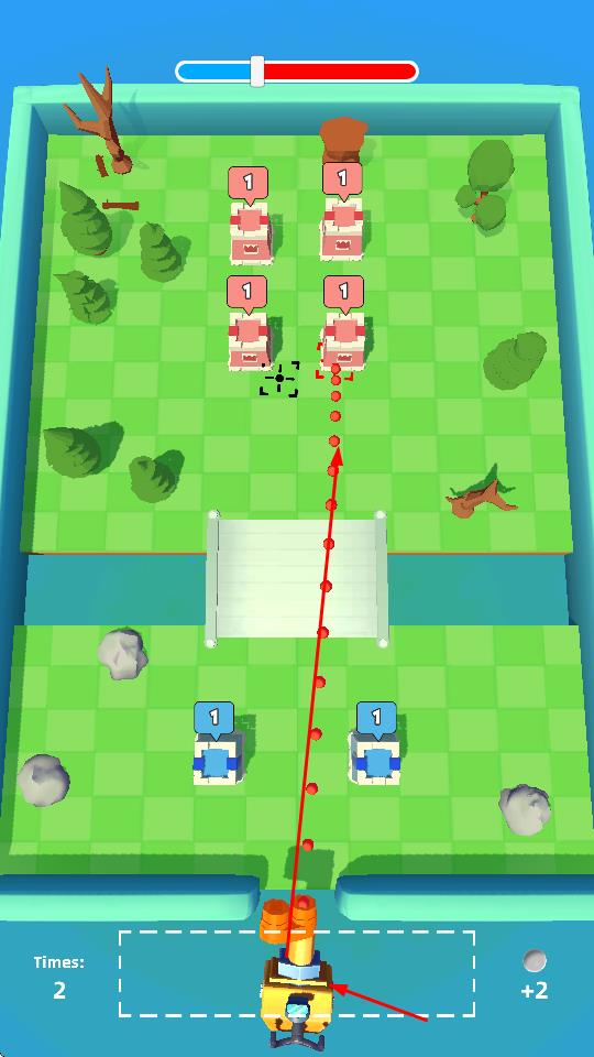 2、战斗时,操控炮台瞄准敌方建筑,发射炮弹,摧毁敌方防御,推进战线。