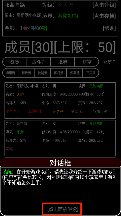 2、创新的AI系统,成员可自主发展能力,基础功法容易获取,绝学需要机缘,隐藏武学需要特定条件解锁。