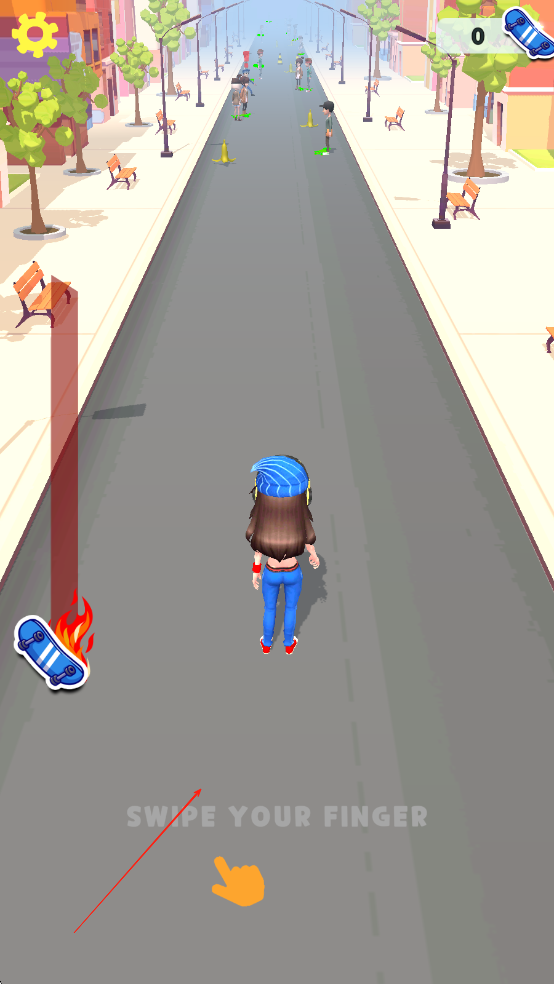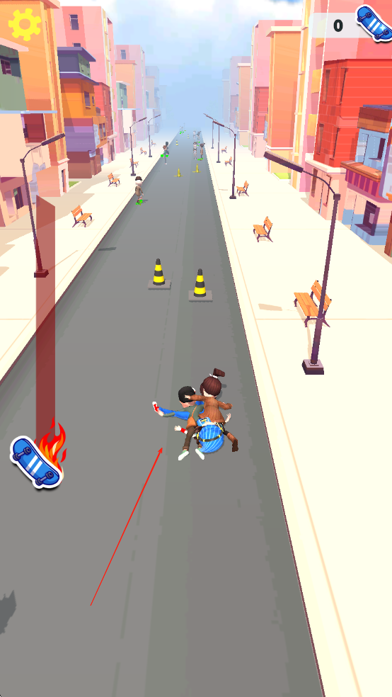 2、遇到路人时径直撞击夺取其滑板,被撞者会加入队伍跟随滑行,同时收集沿途金币与加速道具。