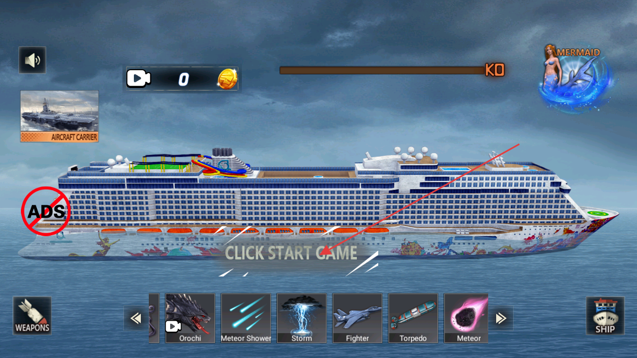 1、点击“CLICKSTARTGAME”按钮,开启游轮对战,选择武器(如MeteorShower)准备攻击。
