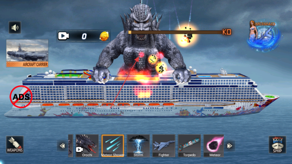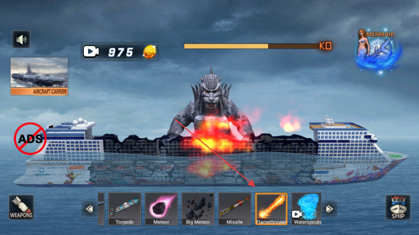 3、战斗中切换不同武器(Torpedo、Flamethrower等),消耗怪兽血量,直至KO目标,推进关卡。