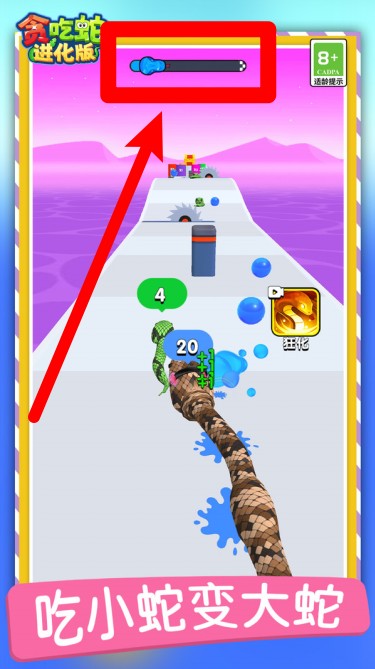 1.上方紫色横条为成长进度条,吞噬能量球会逐步填满,满条后可进入强化或狂化阶段。