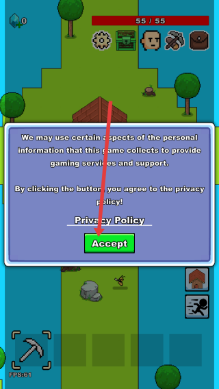 1、进入游戏,通过点击【Accept】接受隐私政策,开启像素世界的生存冒险之旅。