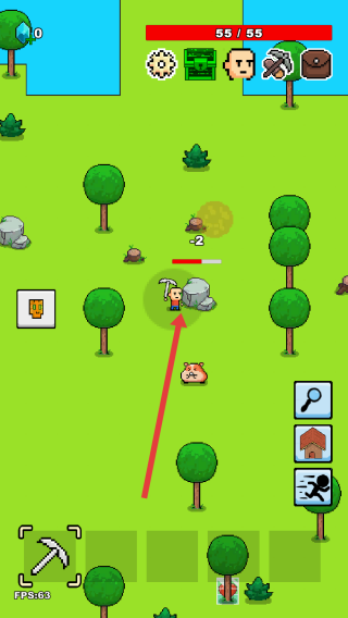 2、操控角色,前往箭头指向的石头,可以使用工具采集资源(如矿石),积累生存物资。