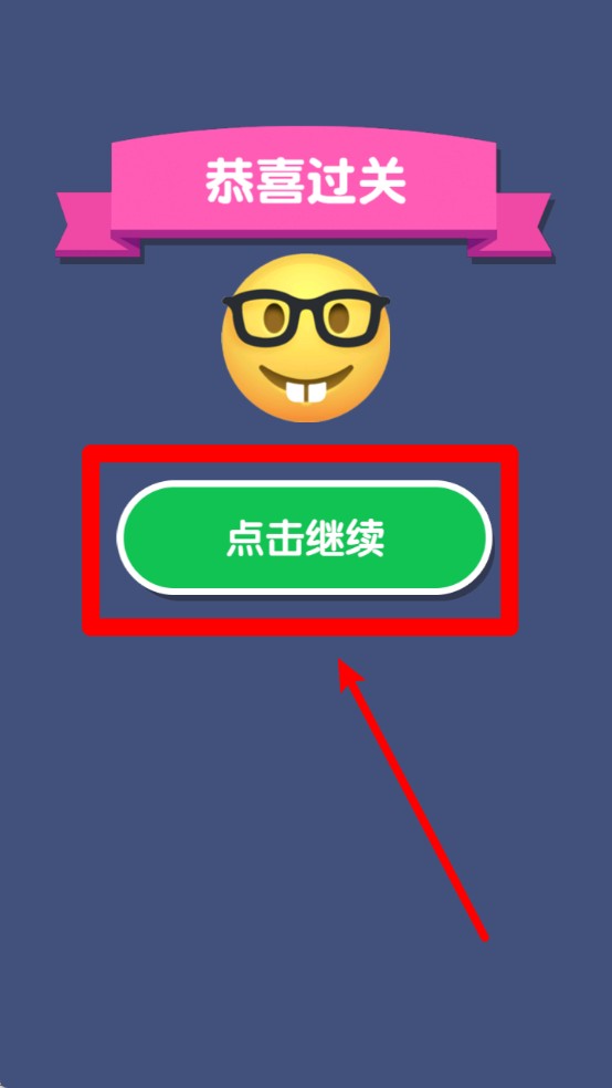 2.当出现“恭喜过关”画面时,请点击绿色按钮“点击继续”以进入下一关卡挑战。