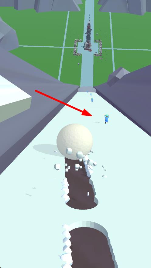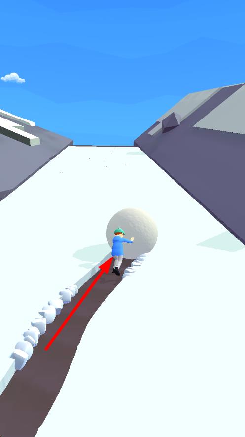 1、进入关卡后滑动屏幕调整雪球初始推力,沿斜坡向下滚动时,左右倾斜设备控制雪球轨迹,收集沿途的蓝色冰块(+体积)与黄色星星(+分数)。