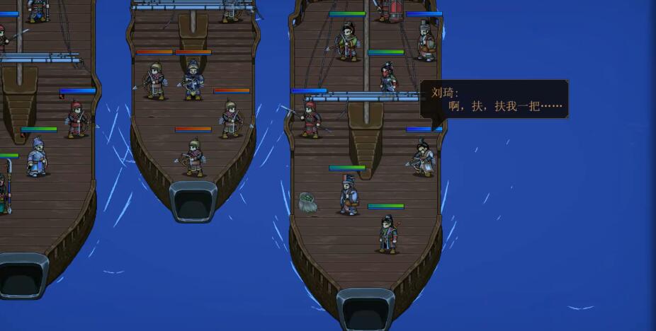 1、叙事沉浸:刘琦受伤情境、水战背景(舰船、海浪)、救援互动,通过“危机场景→角色对话→操作反馈”的链路,强化三国水战的叙事代入感。