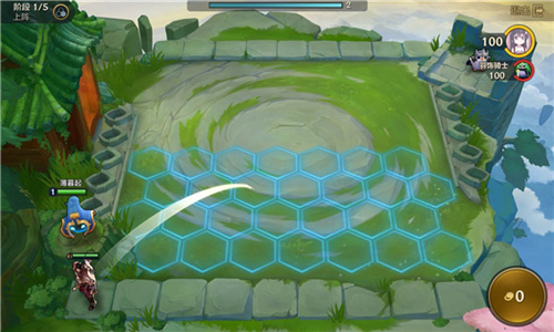 1、进入游戏战斗阶段(阶段1/5),熟悉六边形棋盘布局,将英雄(如露露)布置到棋盘,利用初始回合适应战斗规则。