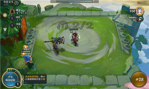 2、推进到阶段5/11,关注人口与英雄阵容(如凑战士羁绊),适时点击【购买经验】提升等级,解锁更多上阵位。
