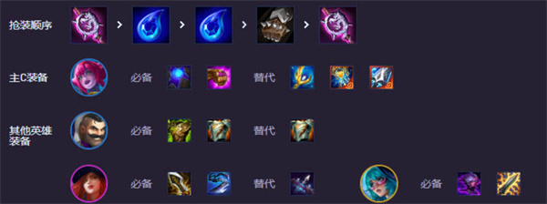 灵活装备位:厄运小姐可装备无尽之刃+巨人杀手+法爆,作为副C补充伤害;阿萝拉装备适应性头盔(降低敌方关键英雄法强)与斯塔缇克电刃(弹射伤害)。
