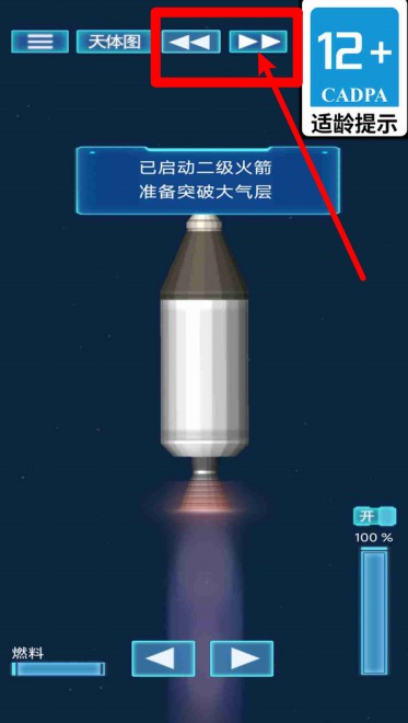2.时间推进按钮:界面上方双箭头为时间控制键,点击可加快飞行速度,用于跳过等待过程,快速推进至关键飞行节点。