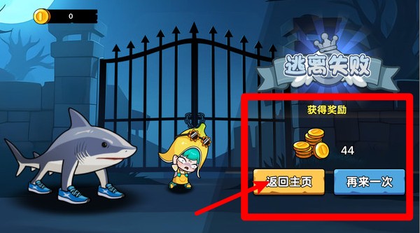 3.若逃生失败会进入结算页面,系统将根据表现发放金币奖励,同时提供“再来一次”与“返回主页”操作供玩家选择。