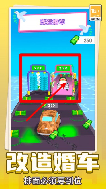 1.改造婚车:选择金币数量高的路线改造车辆,最终打造成梦幻粉色婚车迎接婚礼现场。