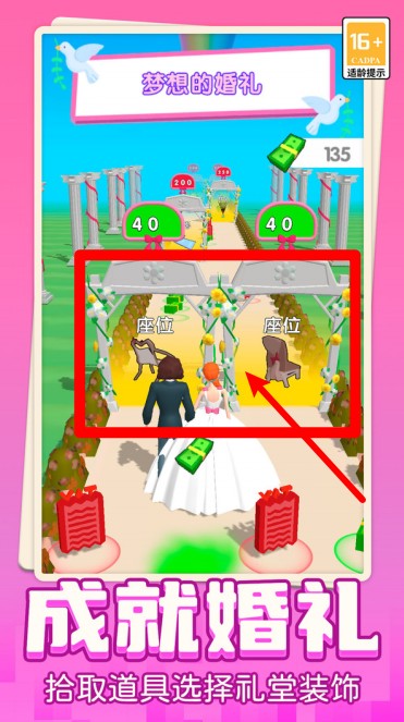 2.成就婚礼:玩家控制角色选择道具装饰仪式场景,越多装饰越豪华,提升婚礼评分。
