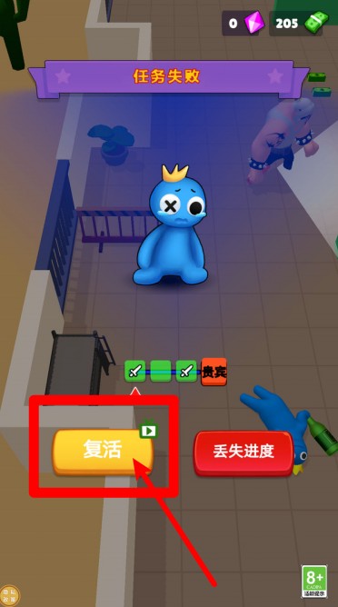 3.任务失败处理:角色被击倒后会进入失败画面,可选择点击“复活”按钮观看广告继续游戏,避免重新开始挑战。