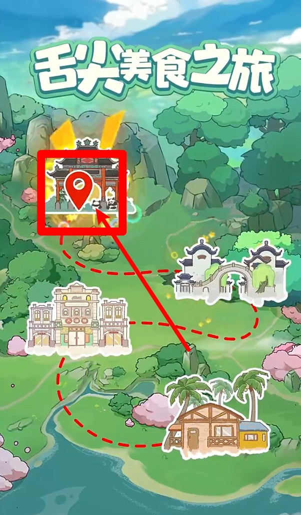 3.定位地标关卡:选中带有红色图钉的区域建筑,即可开启当前章节的任务内容,展开全新美食故事与地标式挑战。