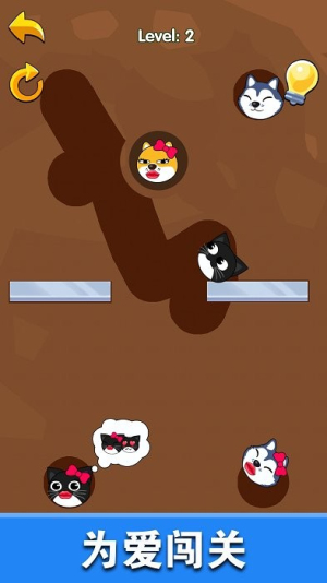 1、基础玩法是通过滑动屏幕挖通泥土,找出隐藏在泥土下的相同狗蛋进行配对,成功配对后即可通关。