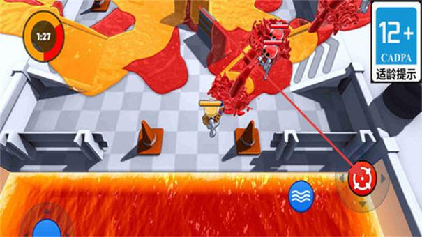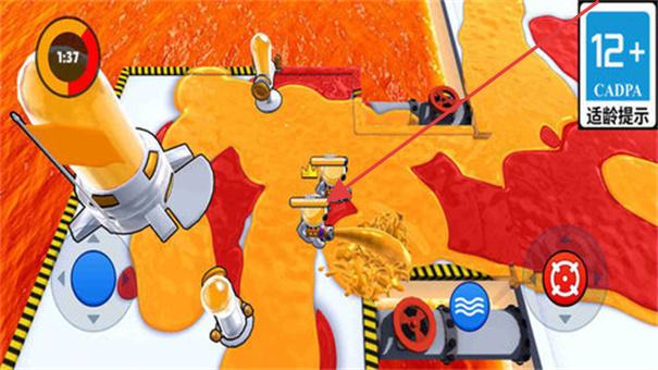 3、回到熔岩关卡,操控角色靠近火焰区域,借助场景装置(如黄色喷枪),按箭头方向喷射灭火。