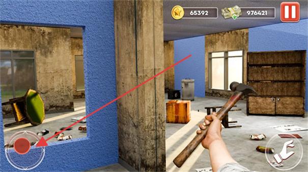1、在破旧房屋场景,操控手持锤子角色,按箭头指引破坏指定位置(如蓝色墙体),获取改造资源。