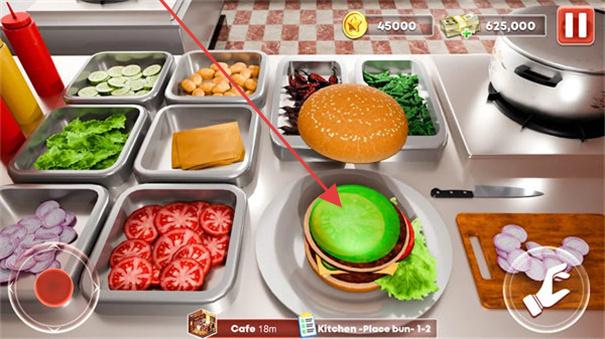 3、在食材准备界面,跟随箭头,将指定食材(如绿色蔬菜)放置汉堡对应层,完成菜品制作,推进经营。
