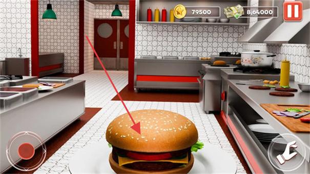 2、进入厨房场景,依据箭头提示,点击桌上汉堡,开启制作或升级流程,积累金币等货币。