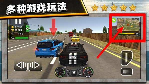 1.任务导航小地图:屏幕右上角显示实时小地图,玩家可通过箭头与标记快速找到任务位置,有效提升驾驶与追捕效率。