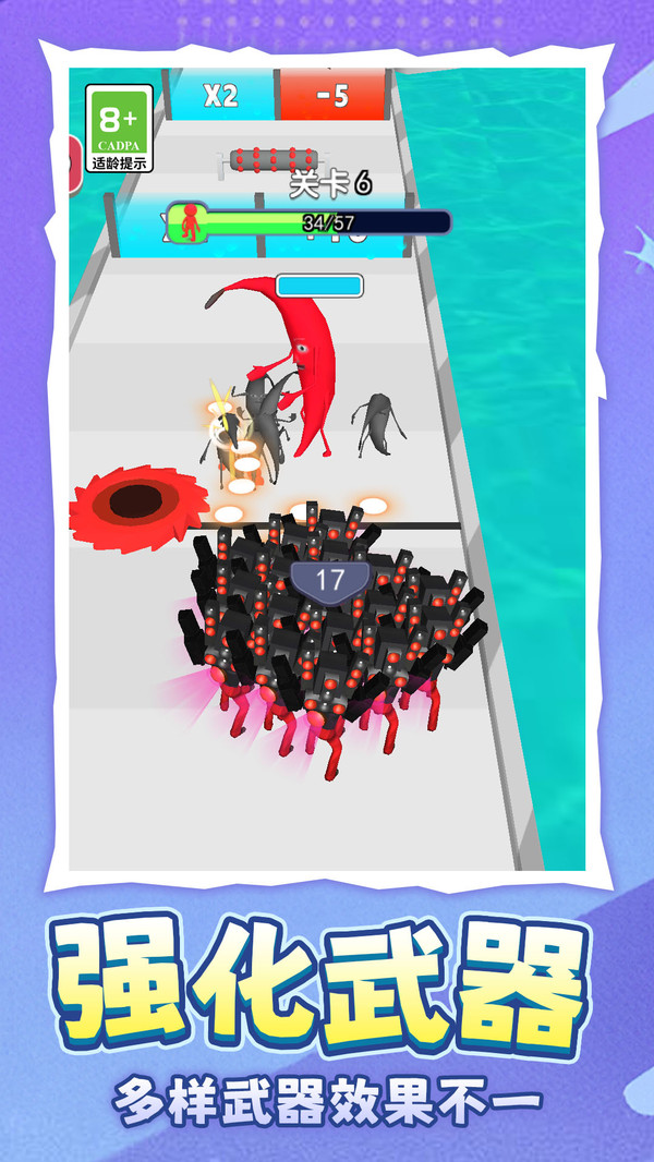1.滑动控制方向:玩家只需滑动操作角色移动方向,避开道路障碍,同时优先选择加人数与加攻击力的路线快速成长迎战终点敌人。