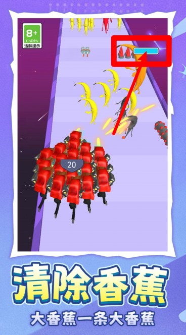 1.进度条表示敌人血量,填满整条就能直接消灭前方全部香蕉怪,节奏超快。
