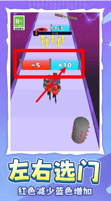 2.前方出现选择门,左边-5右边+10,别犹豫太久,选对门才能保证队伍越打越壮不减员。