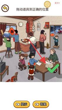 1、在“过年风俗”等关卡,按提示拖动道具(如桌上物品)到正确位置,完成场景解谜。