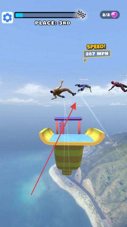 3、操控飞行角色穿越空中得分环,安全着陆后继续滑行,以最短时间抵达终点即可通关并解锁新赛道。