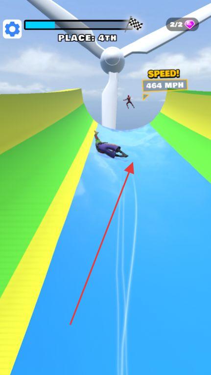 1、进入游戏后选择关卡,在起点位置滑动屏幕操控角色调整滑行角度,点击加速按钮冲入水上赛道。