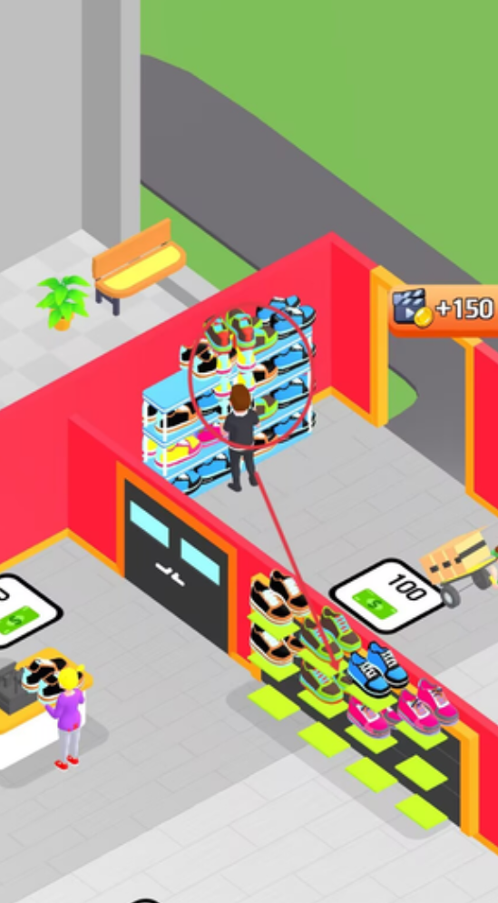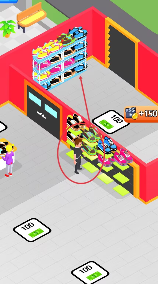 1、滑动屏幕移动角色到仓库,员工会把补货的鞋子放进仓库等着上架。
