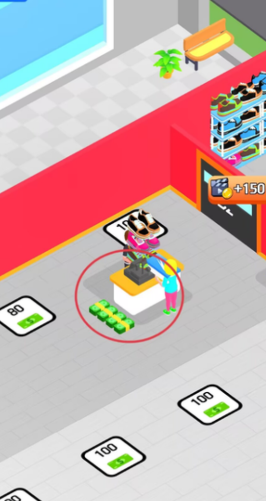 3、客人买完鞋要到收银台结账,赚的钱会存进柜台,攒够就能解锁新区域或进货新品。