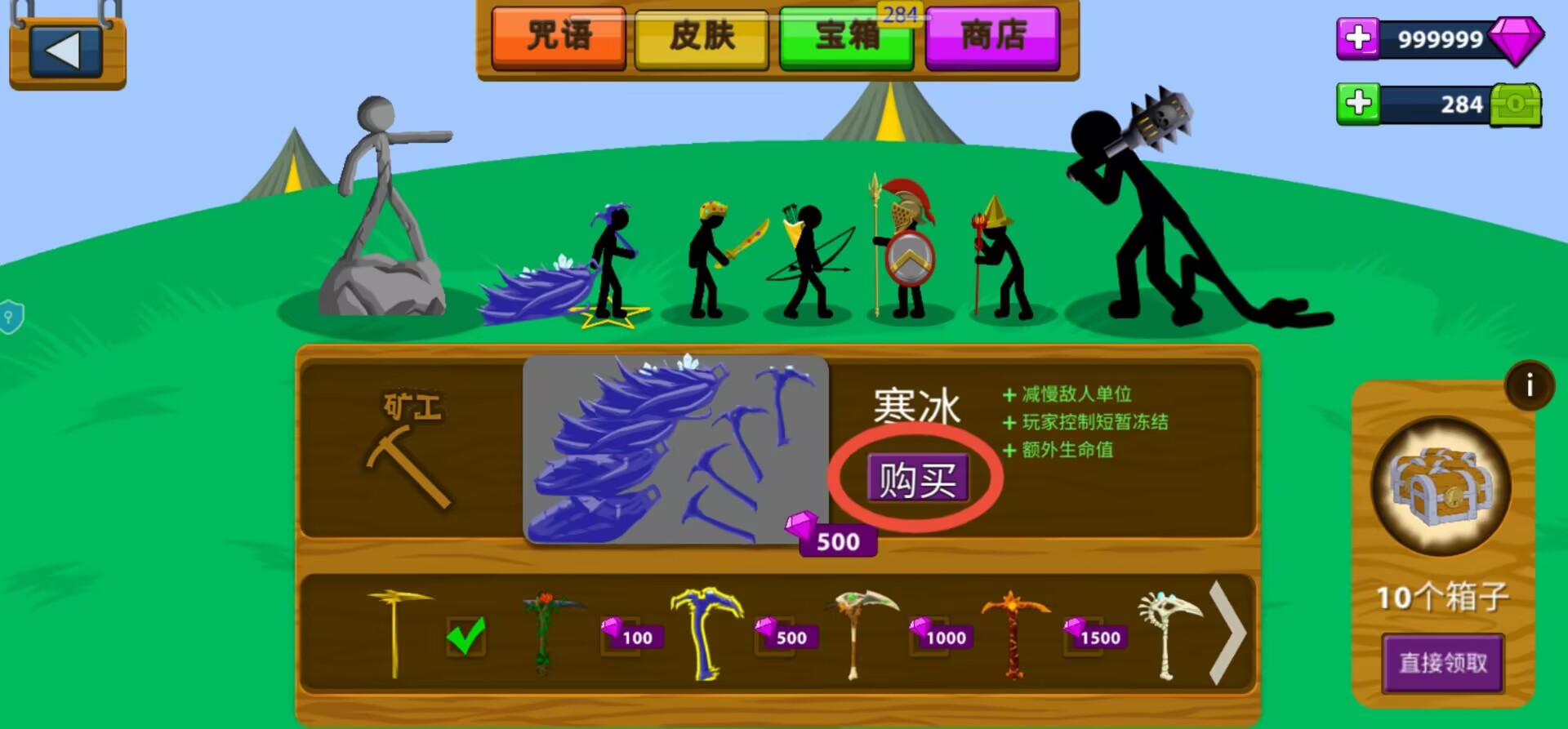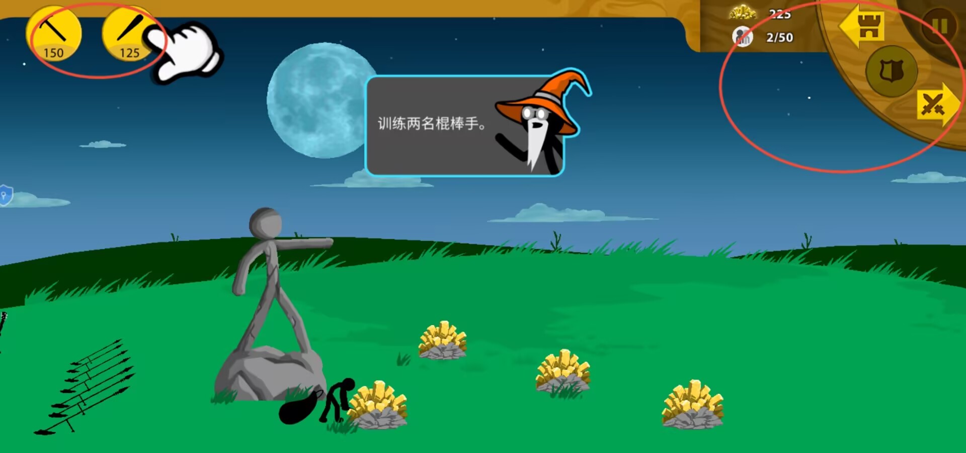 3、界面左侧为矿工招募与武器调用功能键,标注所需黄金数量,右上角显示当前资金余额,战斗指令通过双剑图标触发。