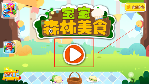 1、轻触屏幕中央开启游戏,带领宝宝进入森林美食派对。