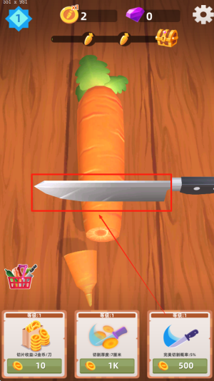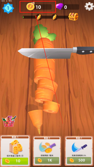 2、界面右上角实时显示获得金币数量,用于购买各类强力刀具。