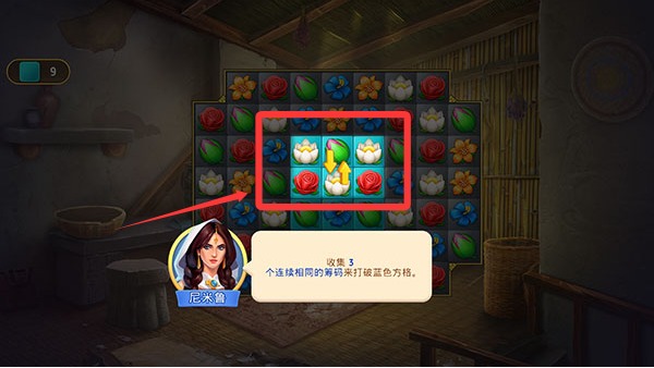3、我们只需收集3个连续相同的筹码来打破蓝色方格,打破所有的蓝色方格即可完成关卡。