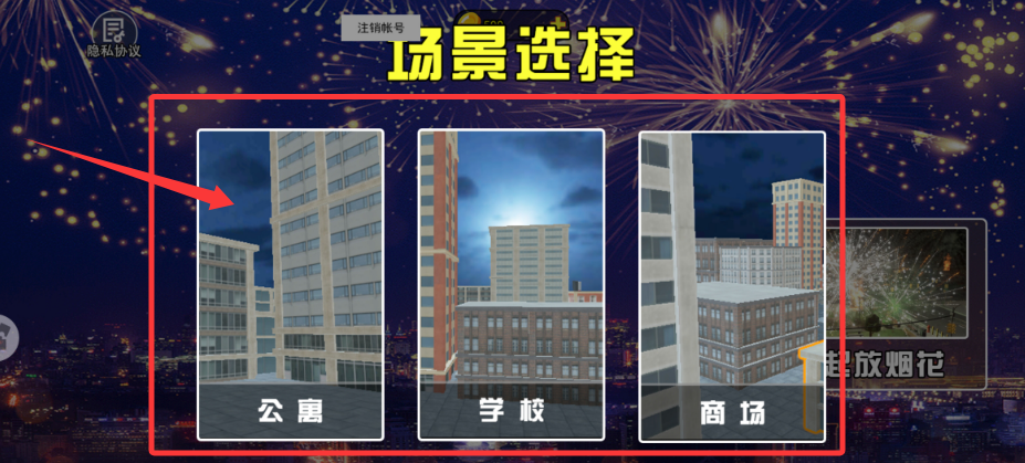 2、在场景选择中,从公寓、学校、商场等场景中挑选心仪的背景,设计专属燃放方案。