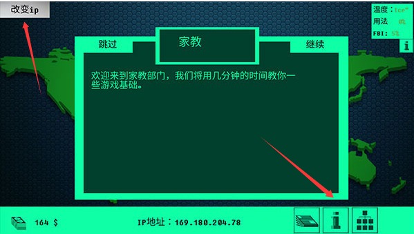 3、开始游戏后左上角可以花费金币更换自己当前的ip地址,防止被检查机构查到,右下角分别是新闻、信息以及升级页面。