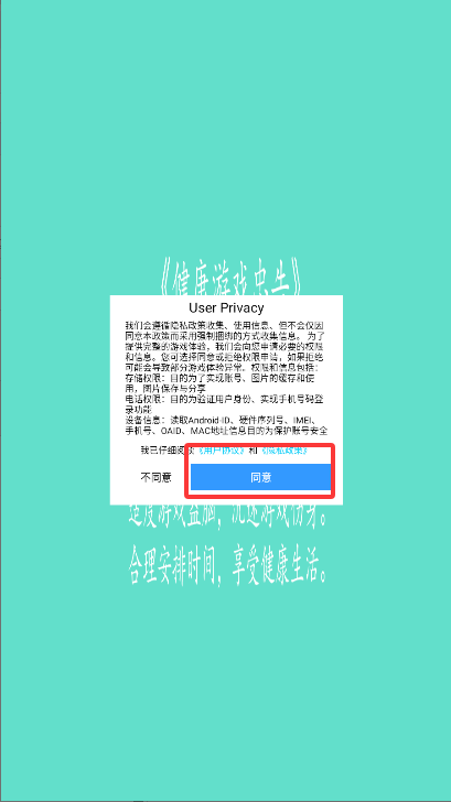 1、下载安装好游戏后打开,点击同意协议进入游戏。
