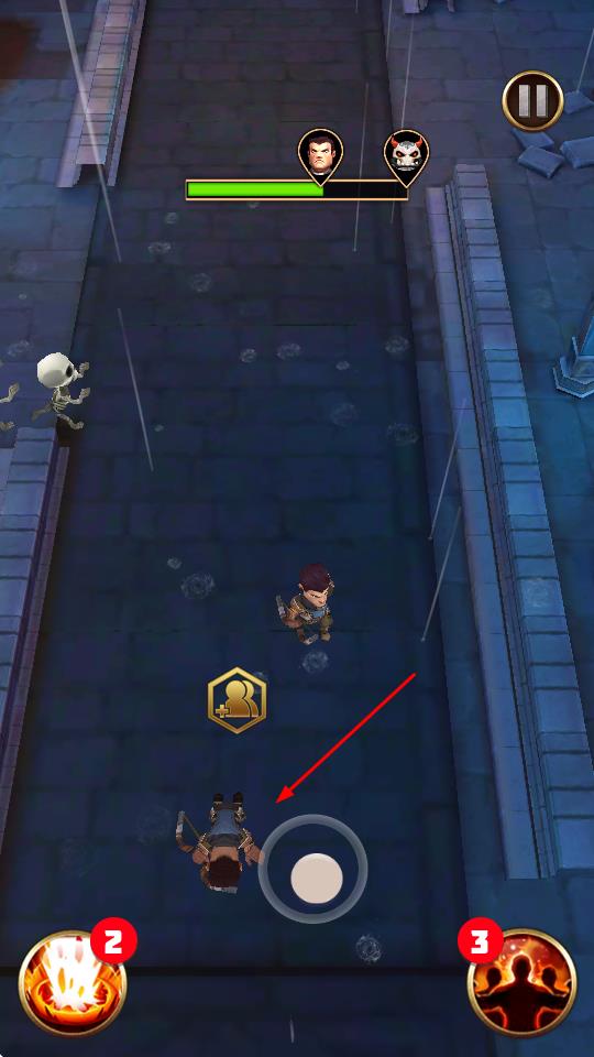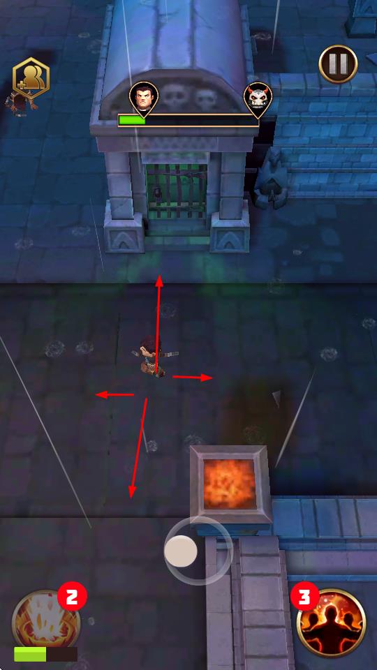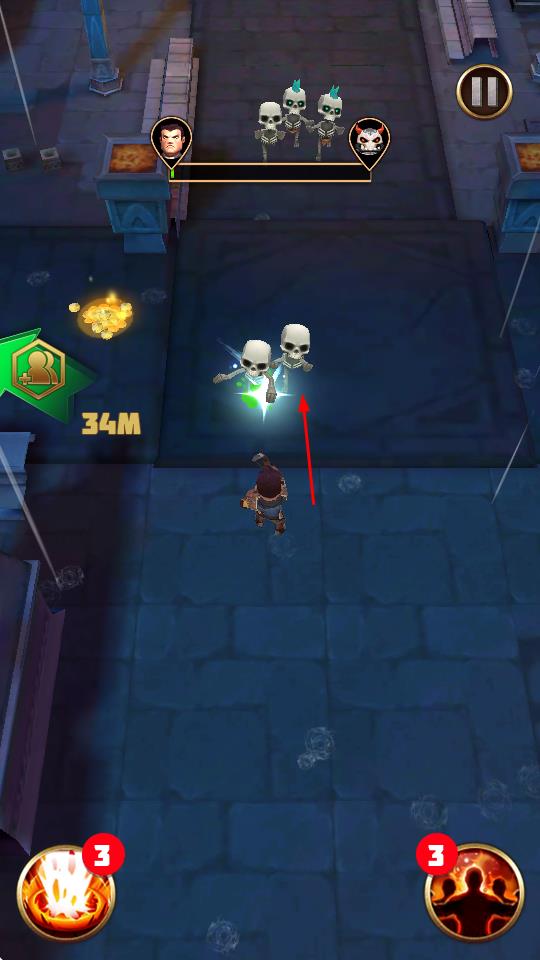 1、操控角色移动,在地牢场景探索,靠近骷髅怪触发战斗,点击技能攻击。